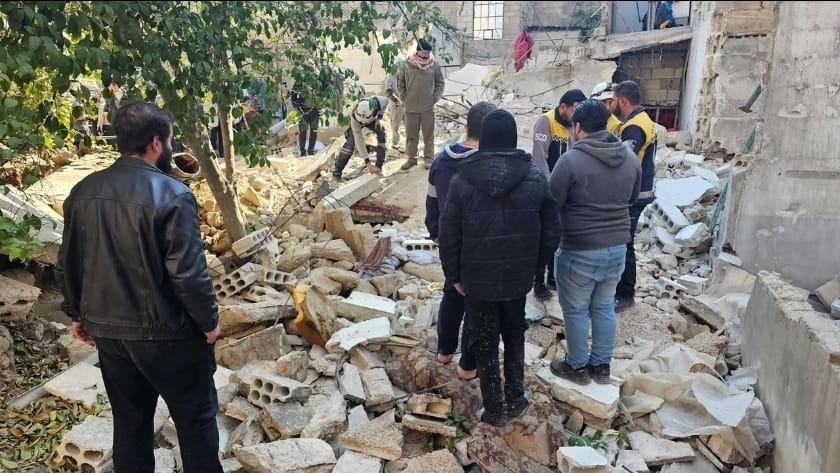 مشهد من موقع انهيار منزل سكني في دوما بريف دمشق، حيث تواصل فرق الإنقاذ والأهالي إزالة الأنقاض بحثًا عن ناجين، في حادثة أعادت التحذير من خطورة الأبنية المتضررة إنشائيًا.