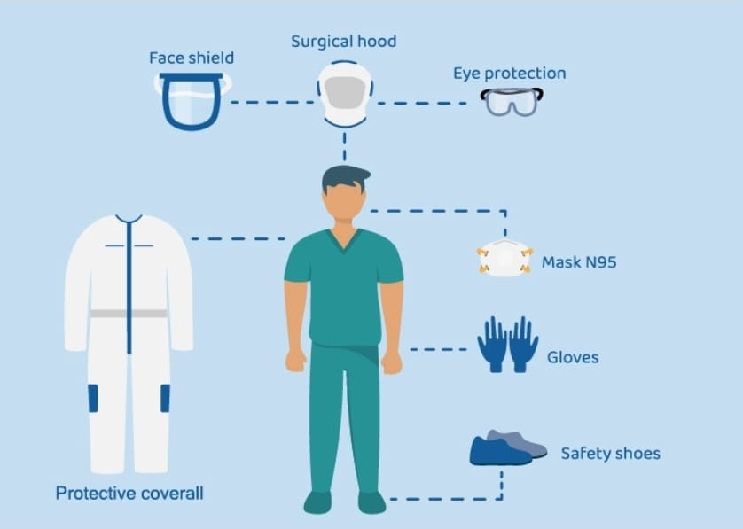 أدوات الوقاية الشخصية المستخدمة من قبل الطواقم الطبية، وتشمل الكمامات والقفازات والملابس الواقية، للحد من انتقال فيروس نيباه أثناء الفحص والتعامل مع الحالات المشتبه بها.