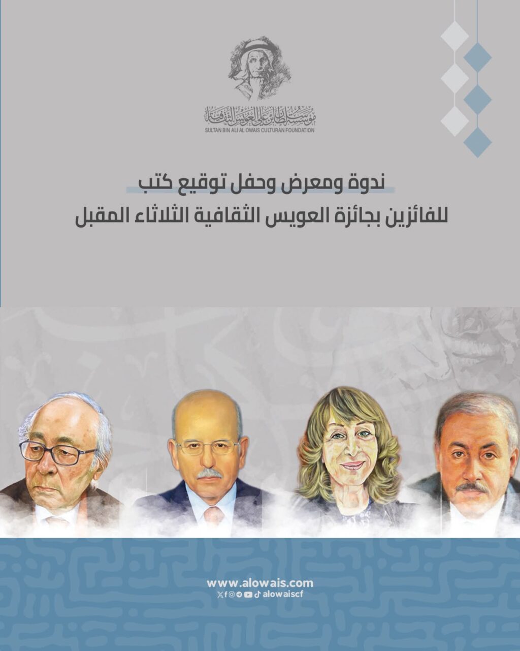 تقيم مؤسسة سلطان بن علي العويس الثقافية في السابعة من مساء الثلاثاء 11 نوفمبر، ندوة ومعرضًا وحفل توقيع لكتب الفائزين بجائزة العويس الثقافية (الدورة التاسعة عشرة 2024–2025)، وذلك في مقر المؤسسة بشارع الرقة في دبي.