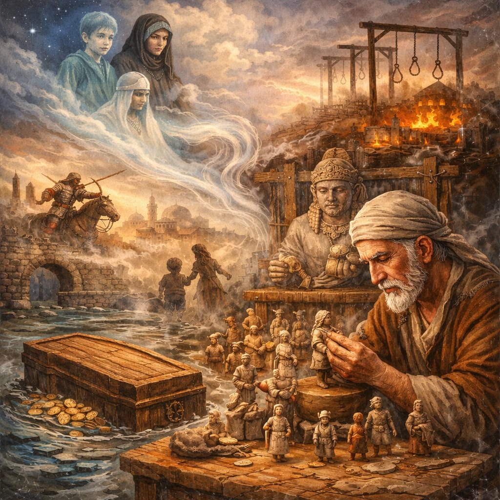 البيت كبير وضيّق على أفقه البريّ، غرفٌ كثيرة تنتهي إلى بهوٍّ كبير فيه معبدٌ بلا صلبان، بكى في عيون الطفل الذي تقمصته روحه، تعلم شؤون التجارة، وحفظ طرق الهند وحلب والموصل واليمن عن أبيه، لحين ما أتاه الحلم الأول من سلسلة الأحلام التي تُنبّئه بالموت، وكان على مسير ليلتين في قافلة محملة بالحرير الدمشقي صوب اليمن، حيث رأى معبداً دون محاريب، تتقاذفه صِبيةٌ ككرة صوف، فيسقط فوق ثلاثة معابد ويكسر محاريبها.