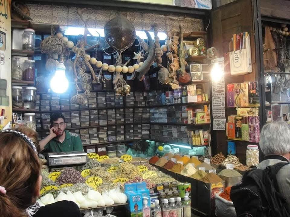 في دكاكين صغيرة، تتكدّس أكوام التوابل بألوانها الحادة: كركم، فلفل، قرفة، هيل. إلى جانبها تُعرض “الزهورات” الشامية—بابونج، نعناع يابس، يانسون—كأنها صيدلية بيتية مفتوحة، تستدعي تقاليد العلاج الشعبي والطقوس اليومية للبيوت الدمشقية.