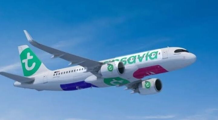 طائرة تابعة لشركة Transavia تحلّق في الأجواء، في مشهد يعكس نشاط الشركة الجوي المعتاد،...