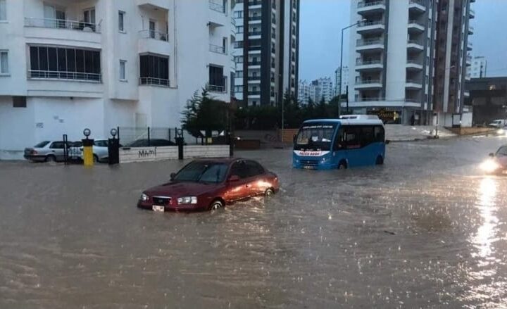 مشهد من شوارع مدينة مرسين التركية بعد أن غمرتها مياه الأمطار الغزيرة، حيث تحولت...