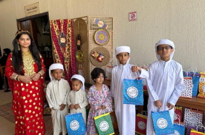 أطفال يحتفلون بليلة حقّ الليلة في الإمارات العربية المتحدة، في مشهد تراثي يجسّد الفرح...