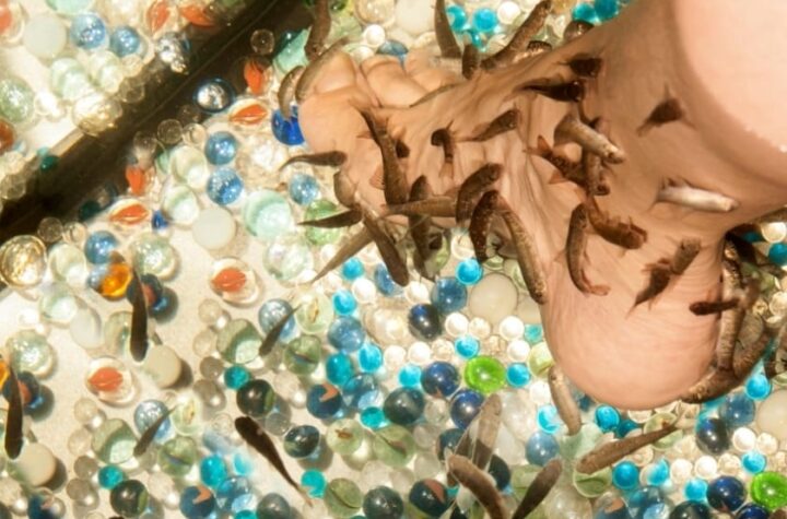 عشرات من سمك غارا روفا تتجمع حول القدمين، في مشهد يجمع بين الفضول والاسترخاء...